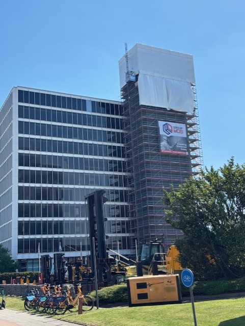 Chantier Ahler BuildingNoorderlaan Anvers Que faisait GroupMDS ? Rénovation de deux tours d’escaliers en bétonConstruction d’un échafaudage de 3500 m² recouvert d’un film rétractableEnlèvement du revêtement existantJet d’eau et réparation d’environ 750 m² de bétonApplication d’un nouveau revêtement inhibiteur de carbonatation